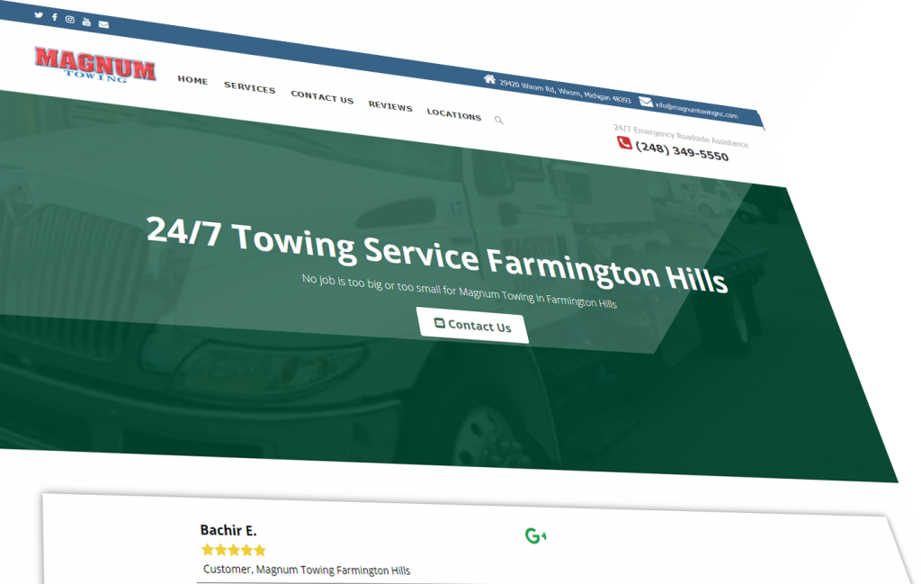 Magnum Towing has been serving stranded, stressed, and marooned vehicles for more than 12 years, and with our 24 hour fast response roadside assistance service, we promise to continue serving our community and our clients with the courtesy, professionalism, and responsiveness they have grown to expect and we feel they deserve. You can find our offices in Wixom, Livonia, Novi, Farmington Hills, Farmington and West Bloomfield.